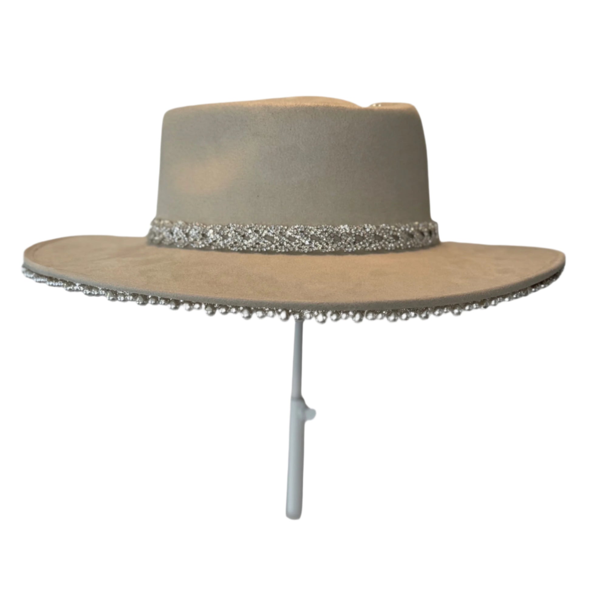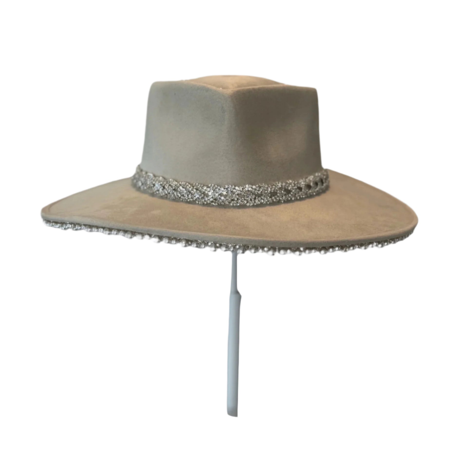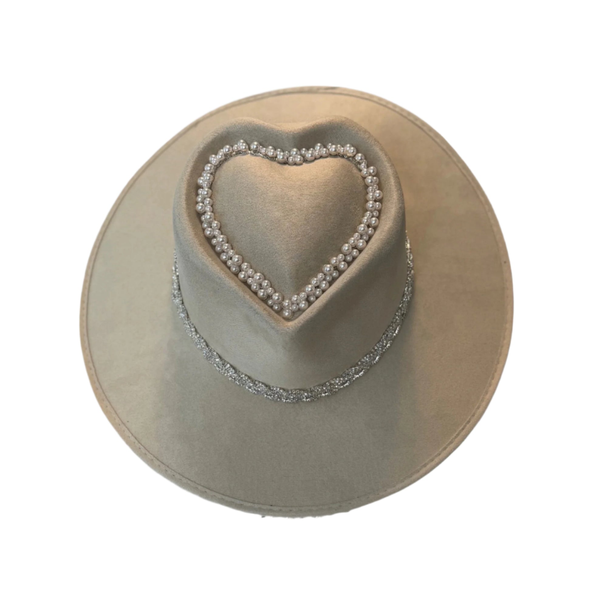 There’s a One Last Rodeo hat style for everyone! If you want to all of the glitz and glam, with your classic and timeless look- then the Maroney Heart hat is the perfect one for you. This hat includes both pearl trim and our silver braided rhinestone trim. All Heart hats are high quality, sturdy and made with a suede fabric called Gamusa. Please note: this hat option is only available in a Medium size.