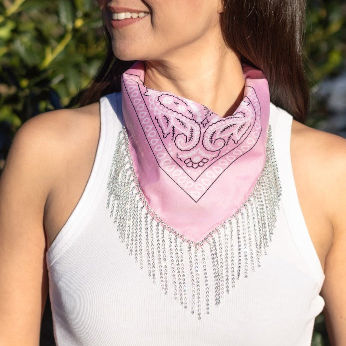 Cotton Bandana with Rhinestone Fringe- Soft pink with silver rhinestones